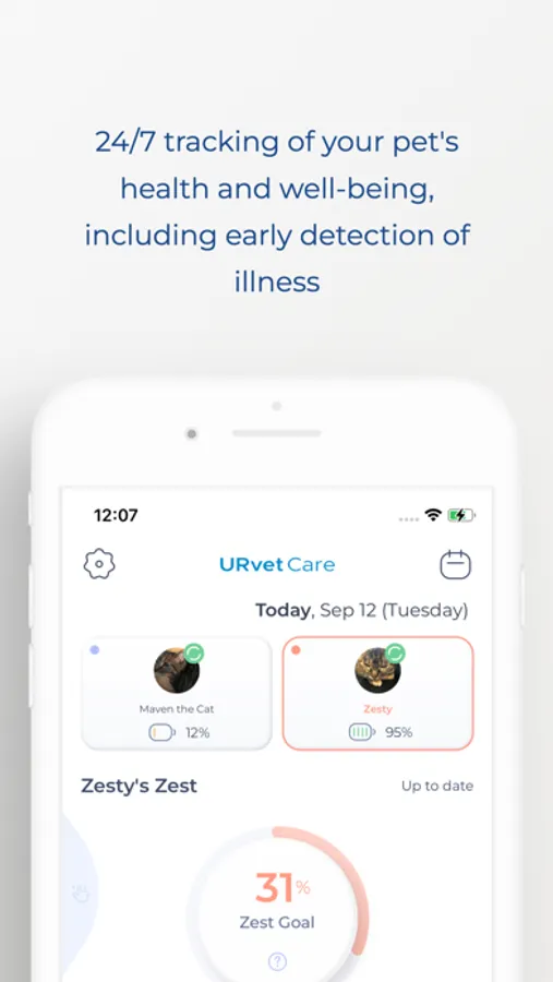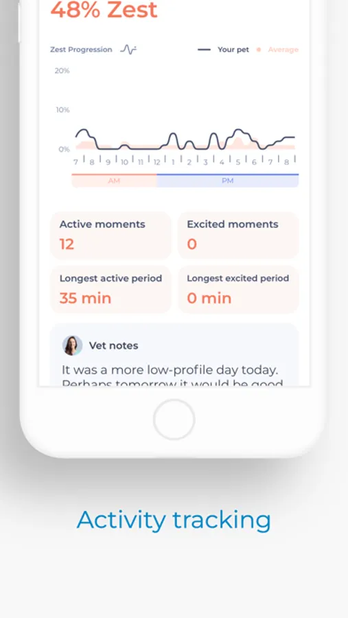 2- You'll get reports on your pet's Zest™ score (a metric of behavior considering their individually assigned daily goal), regular check-ups for you to answer, and more. All info is shared with your vet.
