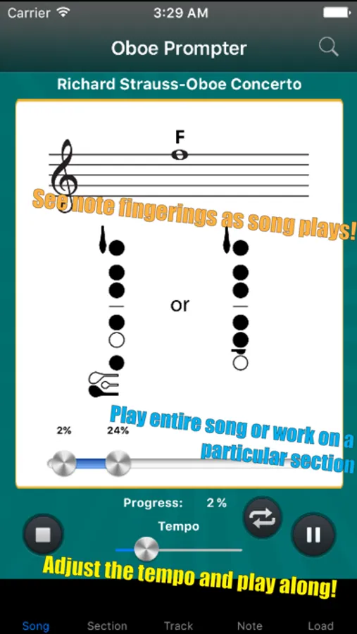 Oboe Prompter can automatically loop either a whole song or a section of a song, so you can highlight a passage you want to focus on and play it along with Oboe Prompter—over and over until you learn it perfectly!