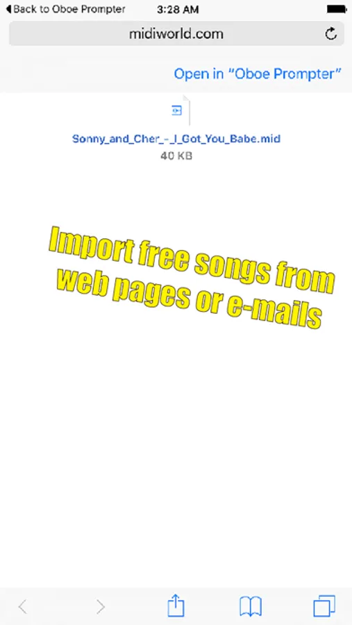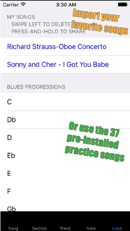 Oboe Prompter is a great tool for people trying to learn to play on their own, or with a private teacher, or in a school environment. Instructors can prepare weekly lessons as MIDI files and e-mail them to students so students can practice the RIGHT music, in the most productive way possible! Delete an imported song by swiping a finger across the title in the song list. Or share an imported song via e-mail, by pressing-and-holding on the song title in the song list.