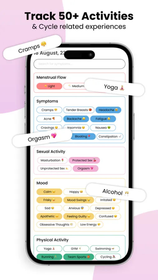 Monitor and record over 50+ activities including symptoms, sexual activity, physical exertion, and more, allowing for a detailed and personalized overview of your monthly cycle. Get predictions on potential symptoms each day to navigate your menstruation with ease.