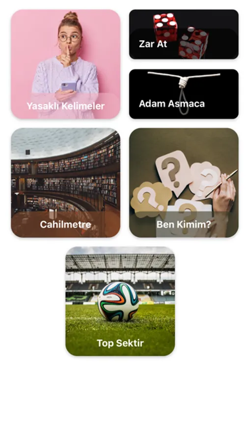 Başta herkesin favorisi Yasaklı Kelimeler ve eğlenceli kişi bulma oyunu Ben Kimim olmak üzere, kült oyunları mobil dünyaya taşıyoruz. "Ben Kimim" en kısa sürede en çok kişiyi bilmeye çalış, "Yasaklı Kelimeler"de ise kelime hafızanı zorla. "Cahilmetre" ile genel kültürünü sına, "Adam Asmaca"da kelime bilgini göster. Kimsenin hile yapmadığından emin olmak için "Zar Atma"yı kullan veya sadece eğlenmek için "Top Sektir" oyununu dene.