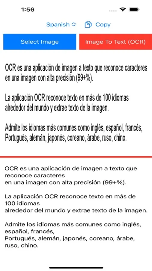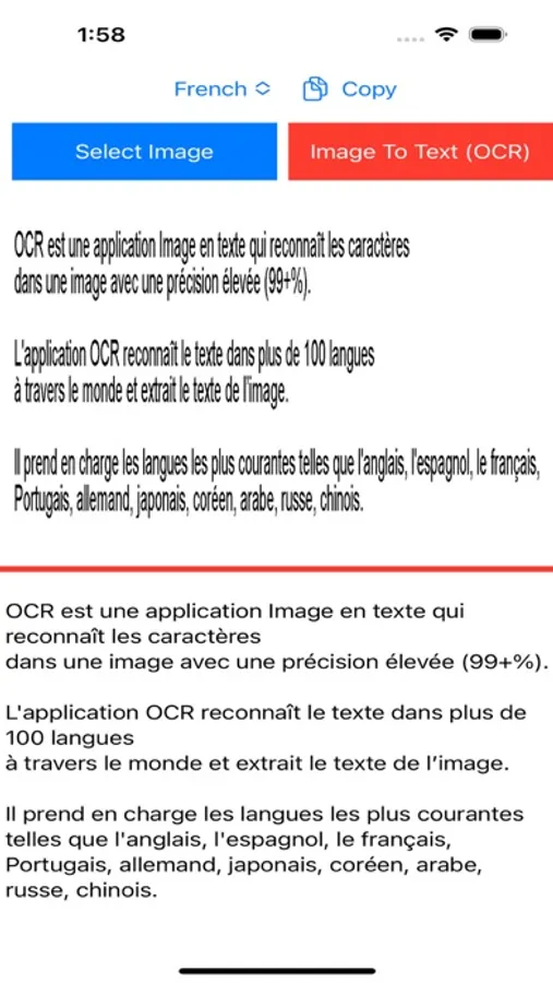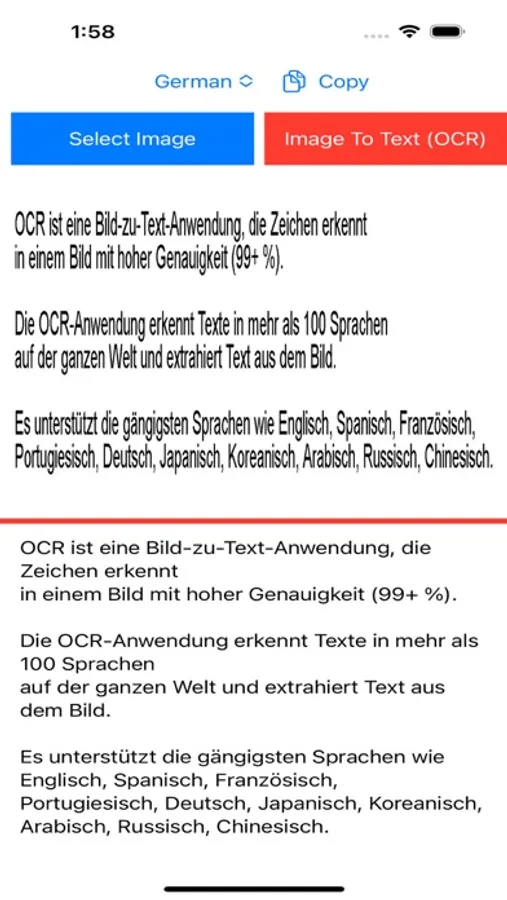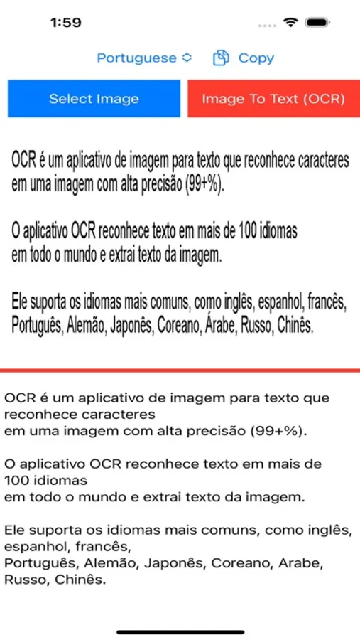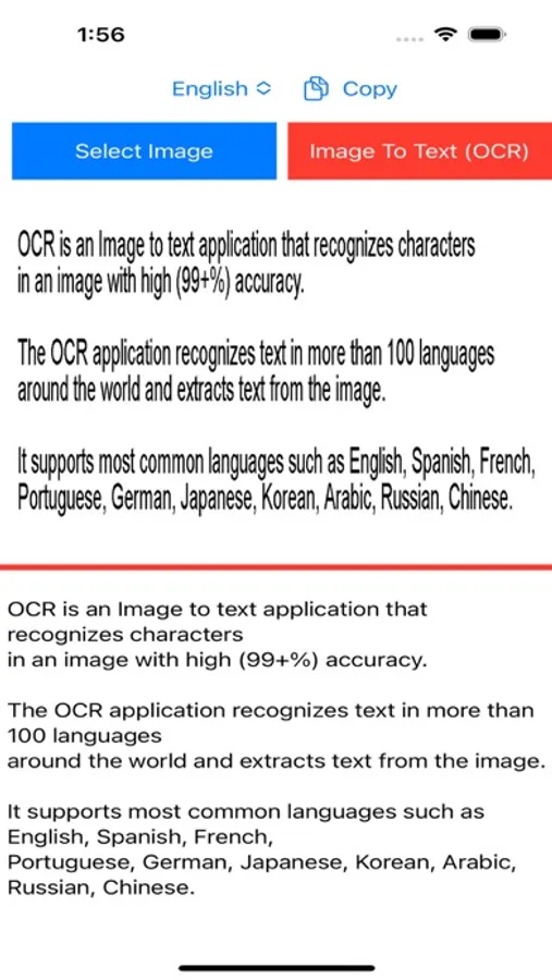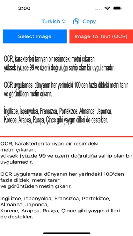 Multi-Language Support: The OCR application recognizes text in more than 100 languages around the world and extracts text from the image. You can instantly obtain your texts by choosing different languages according to your needs. English, Spanish, French, Portuguese, German, Japanese, Korean, Arabic, Russian, Turkish, Bengali, Chinese, Croatian, Danish, Dutch, Hebrew, Hindi, Indonesian, Italian, Latvian, It also supports common languages such as Lithuanian, Marathi, Norwegian, Polish, Romanian, Slovak, Slovenian, Tamil, Telugu, Urdu, Vietnamese.