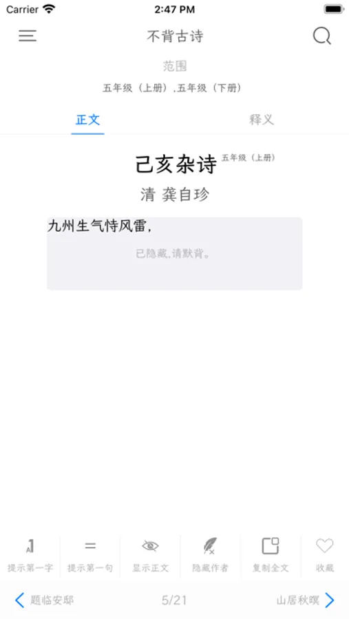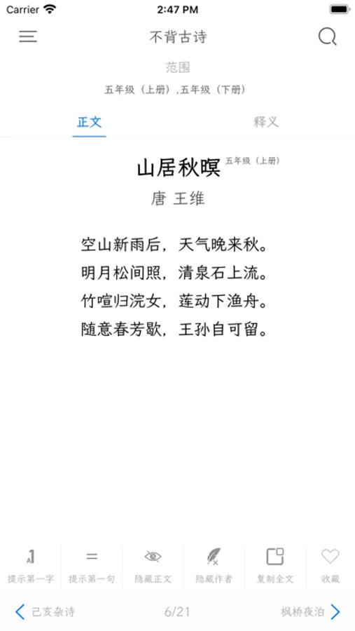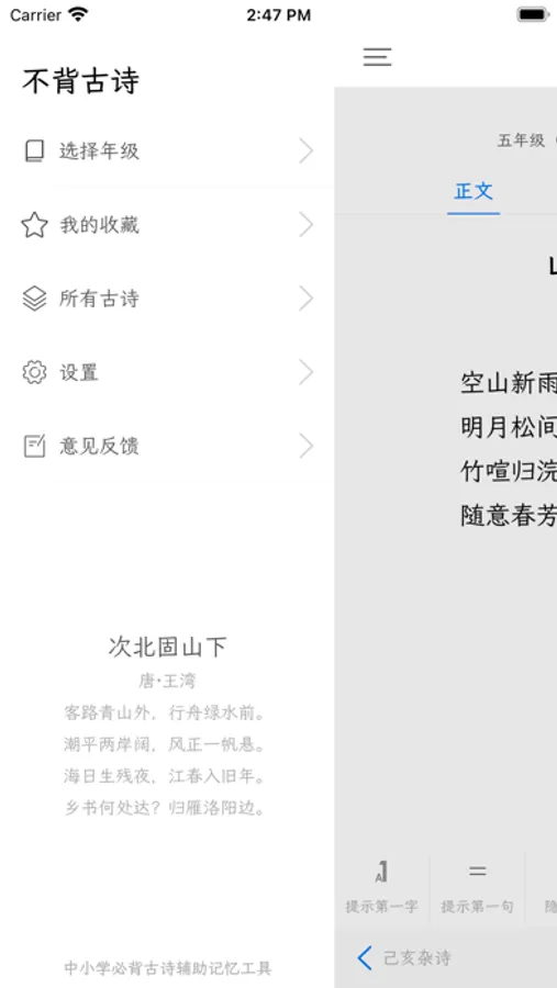 3、可设置背诵模式,如只显示第一句,只显示第一个字,不显示朝代作者。