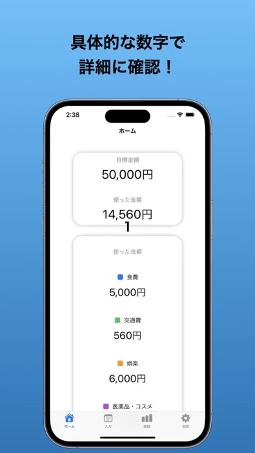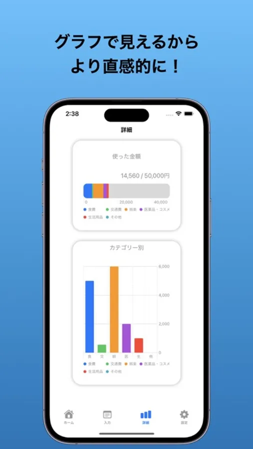 お小遣いや給料の使い道を管理するために使用用途を入力し、それをグラフで表示したりカテゴリーごとに管理する事で、わかりやすく管理することができます!
