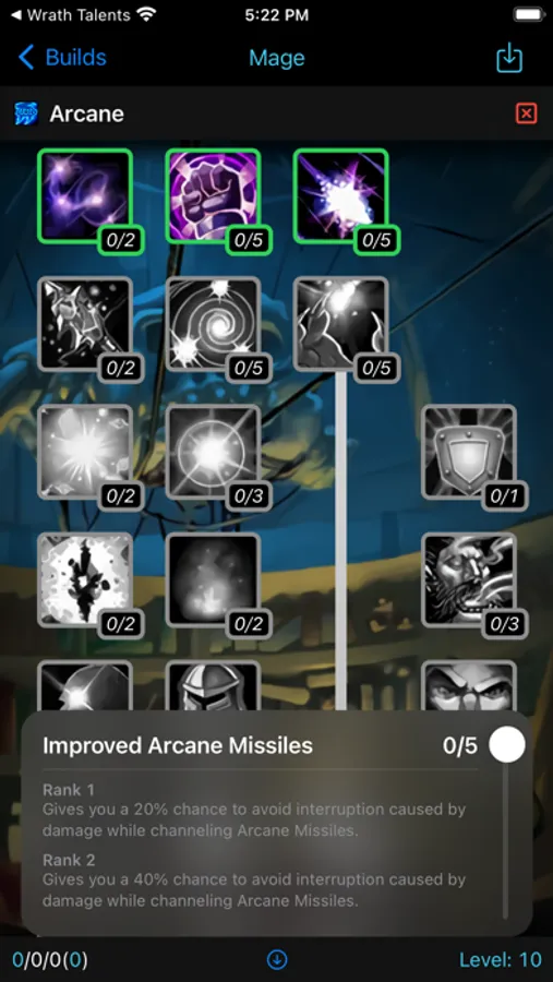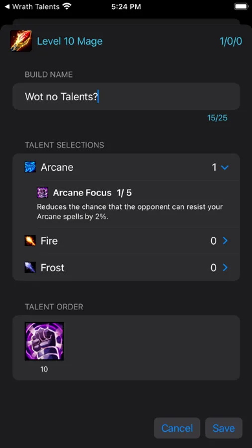* Builds can be saved with talents orders and notes. Can be later modifier or deleted.