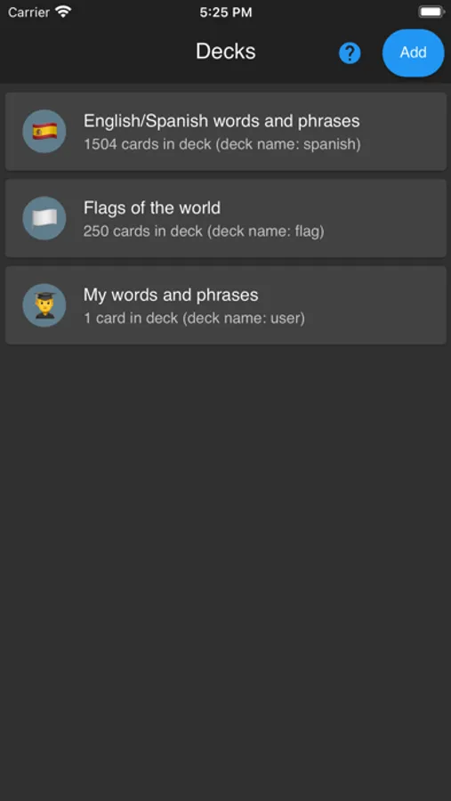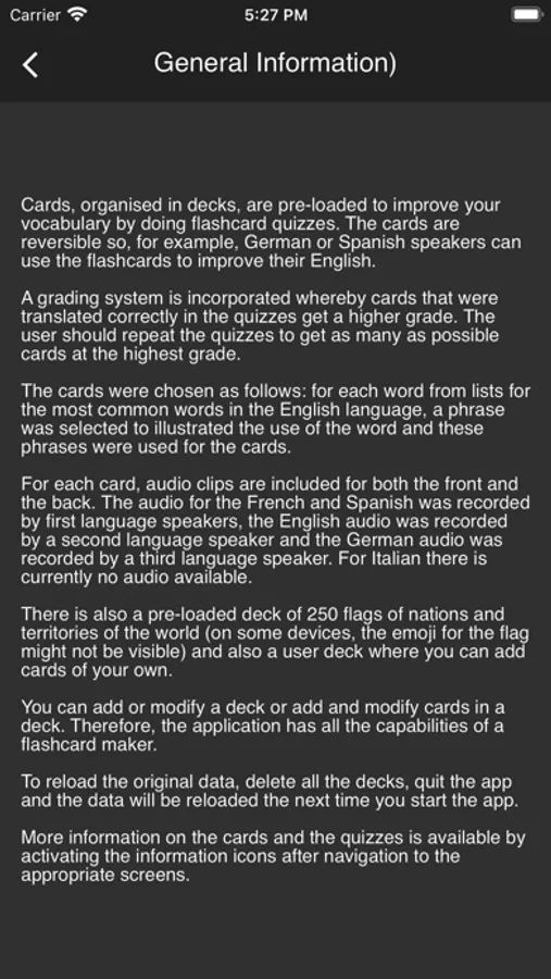 There is also a pre-loaded deck of 250 flags of nations and territories of the world (on some devices, the emoji for the flag might not be visible) and also a user deck where you can add your own new words or phrases.