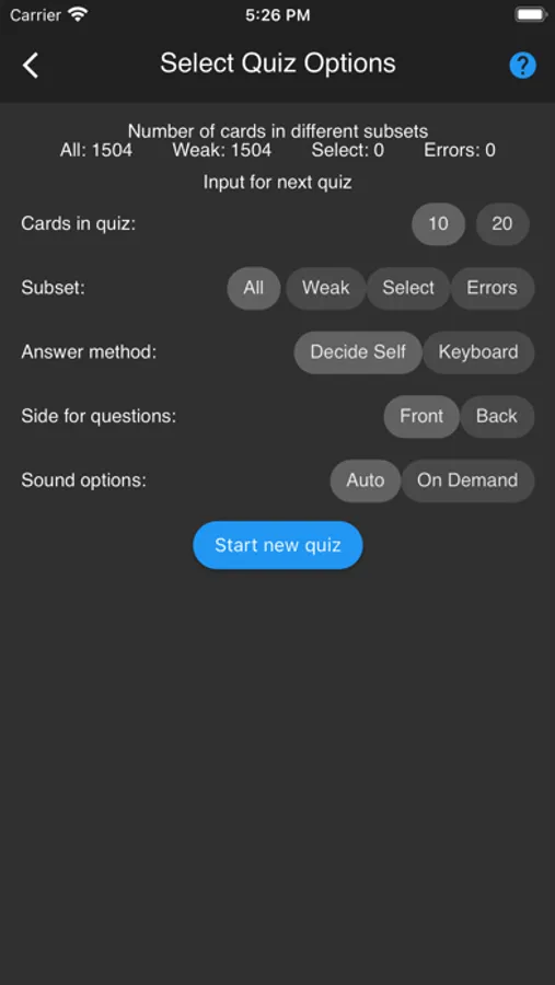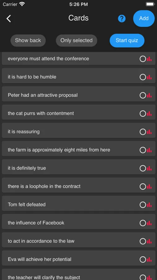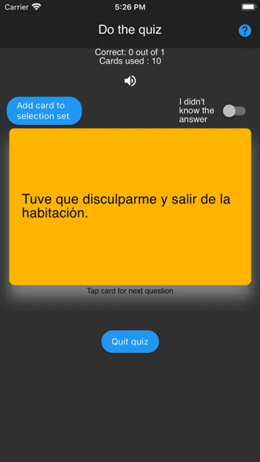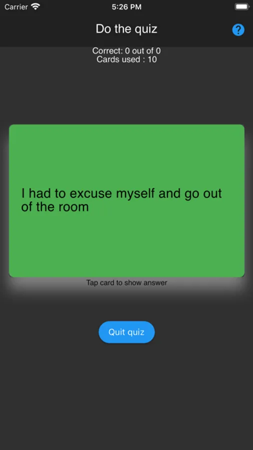 A grading system is incorporated whereby cards that were translated correctly in the quizzes get a higher grade. The user should repeat the quizzes to get as many as possible cards at the highest grade.