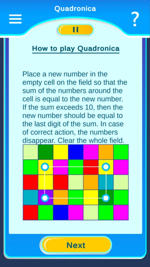 Quadronica: Test pattern identification and earn points by spotting four tiles of the same color in squares or rectangles.