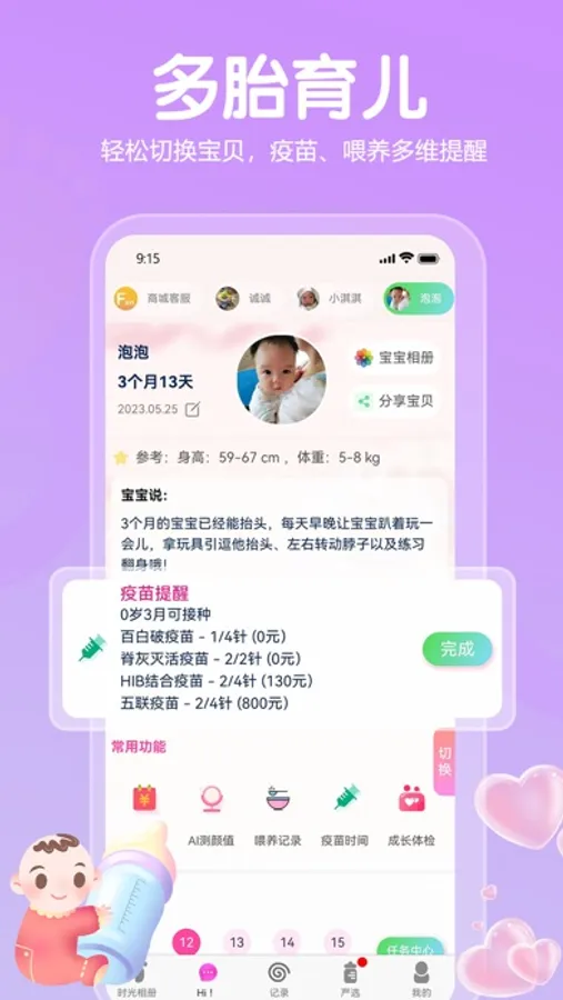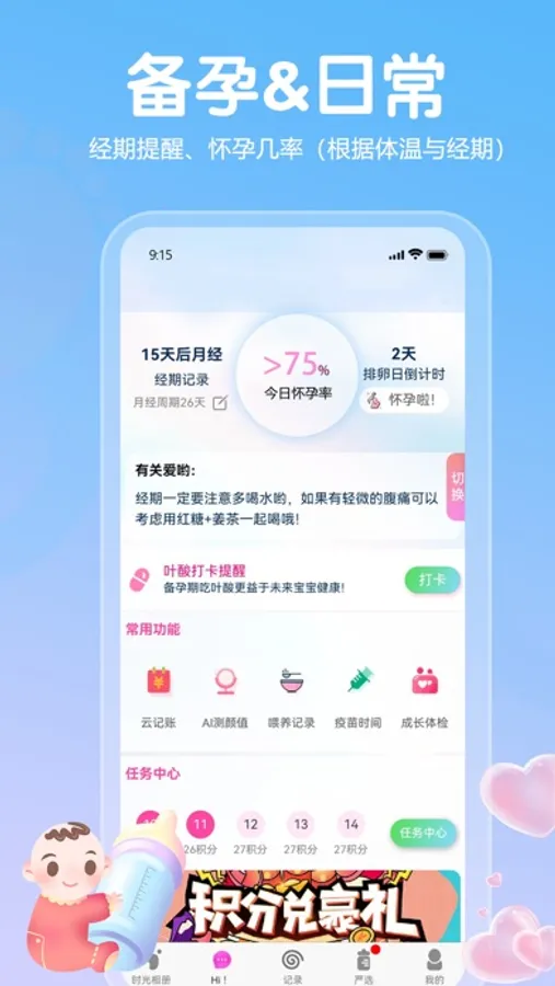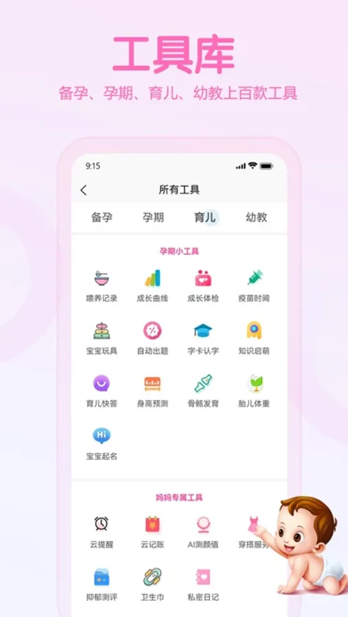 备孕、孕期,育儿到幼教全方位的服务,生日、疫苗、产检、排卵期、月经期等等重要提醒,包括各种实用的小工具,我是您的全能小管家!