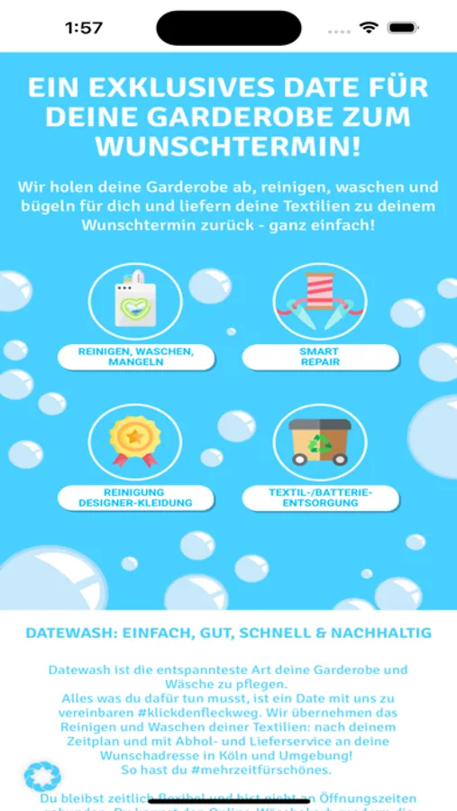 Datewash ist die entspannteste Art deine Garderobe und Wäsche zu pflegen. Alles was du dafür tun musst, ist ein Date mit uns zu vereinbaren #klickdenfleckweg.