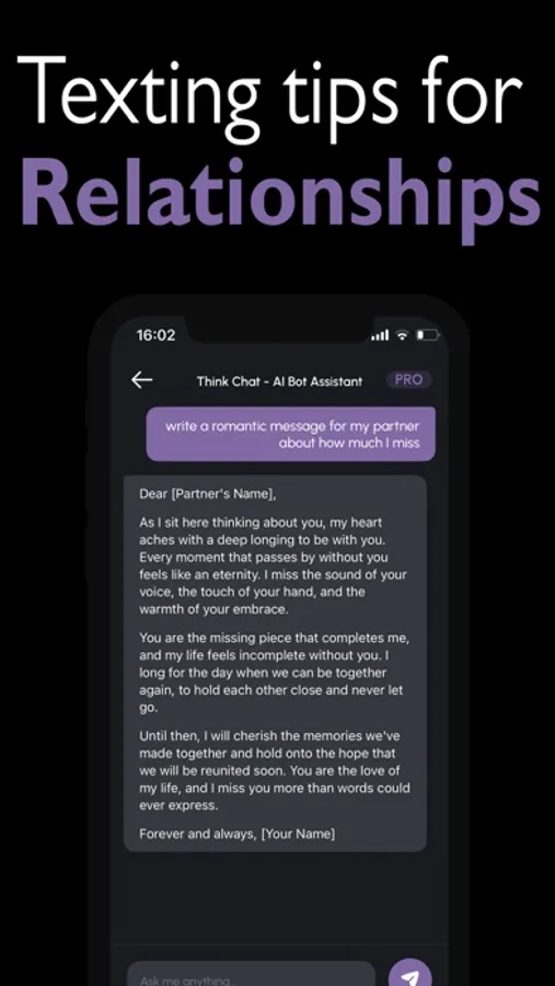 Need help with impressing a girl on text? Or struggling with social media posts? What about writing boring emails? We got you! Think Chat is your personal assistant with the state-of-the- art AI. Ask Think Chat and get answers within seconds.