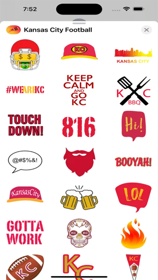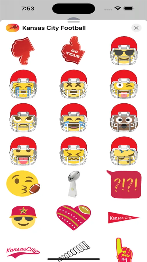 Your Kansas City football experience sticker pack for all ages and those who are football fanatics. Enjoy this KC themed sticker pack with emojis with helmets, fan slogans, hats and gear, football sayings, sticker accessories, etc.