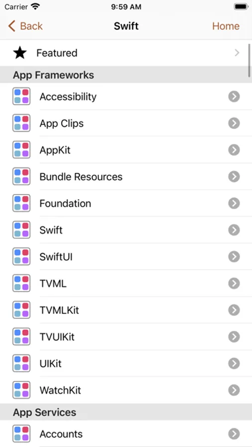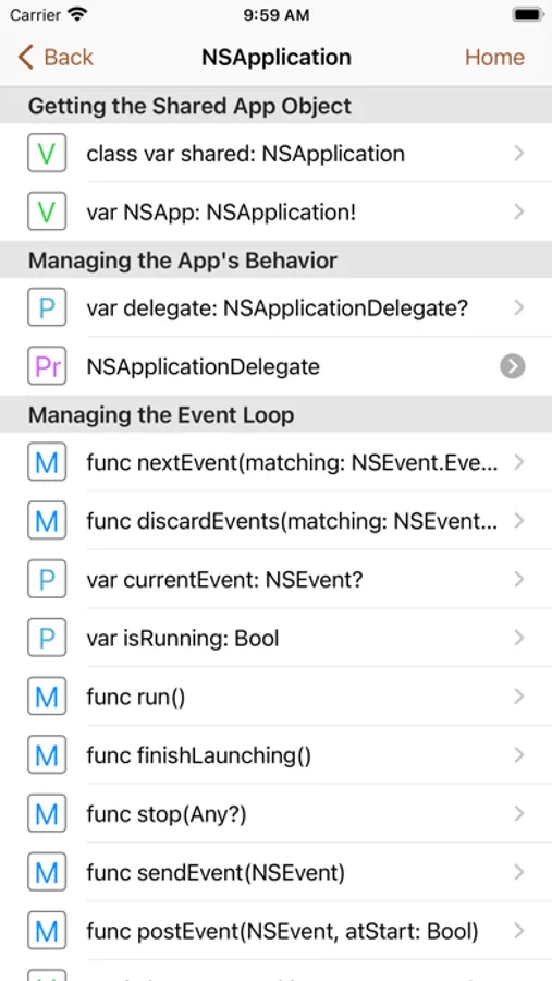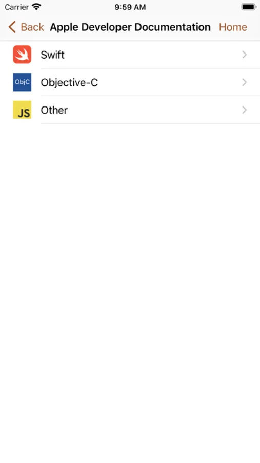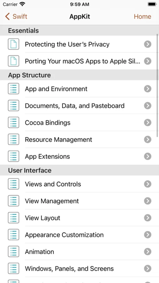 Apple Development Documentation can be browsed layer by layer in a hierarchical structure, which is basically the same as viewing in Xcode. Other types of docsets can be viewed according to API interface types (class, interface, method, etc.).