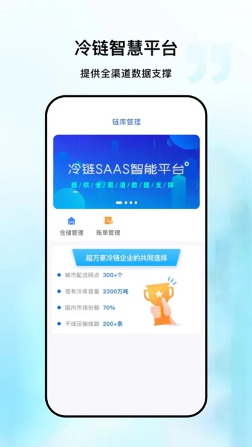 链库冷库数据,实现仓储管理、物流运输、财务管理等全冷链环节的高效管理。基于移动互联技术搭建的企业服务平台,赋予大中小型企业数字化管理能力,实现企业能够查看名下所有仓储、运输、财务数据,做到全渠道业务的链路管理。