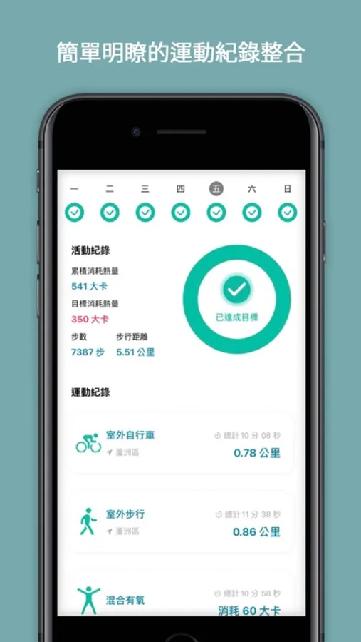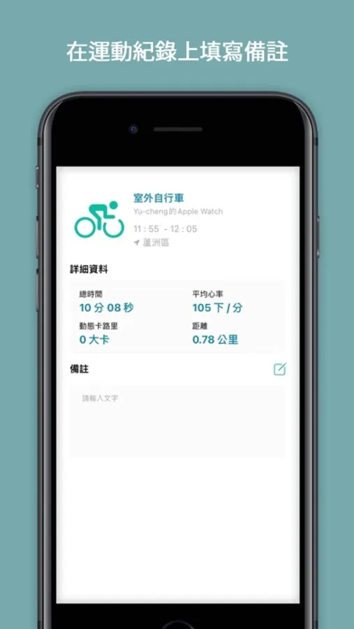 設定好iPhone內建健身活動目標,即可展示簡單明瞭的運動紀錄,同時整合顯示您穿戴式裝置內的運動資料,在該筆運動紀錄中新增備註,用來記錄您每一刻運動時光。