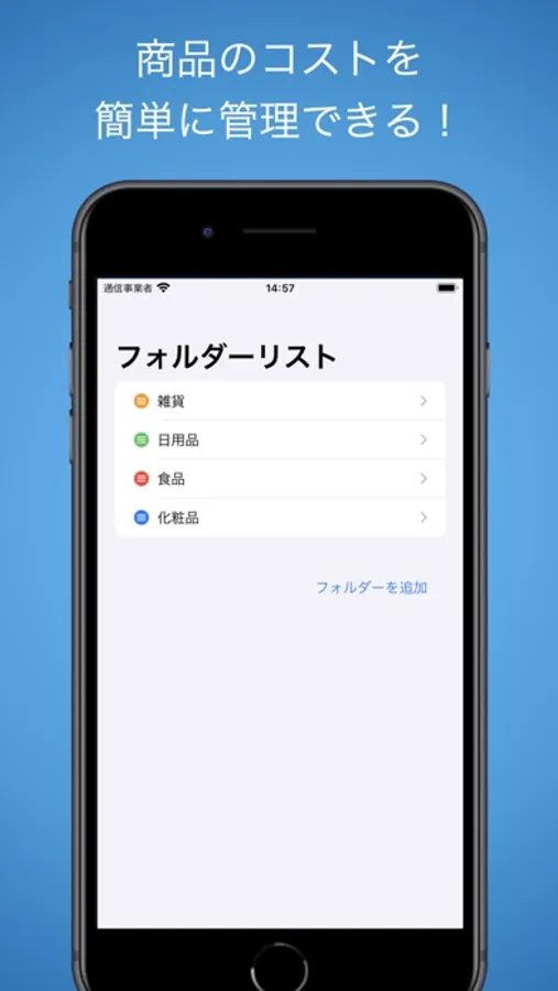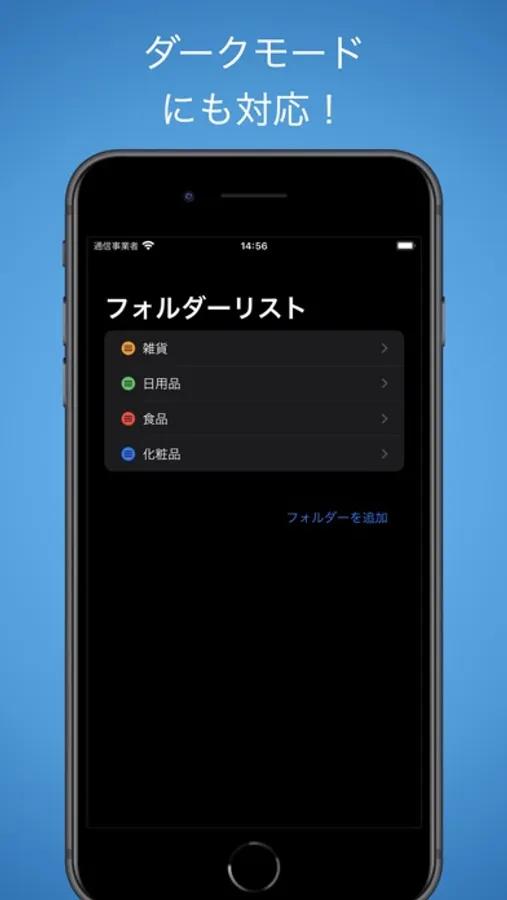- アプリを開いて、最初にフォルダーを作ります(日用品、食品、化粧品など)。