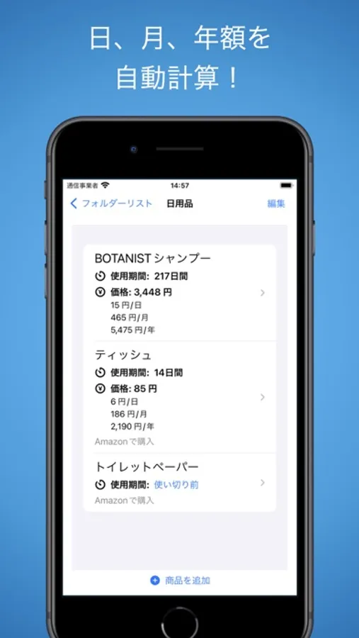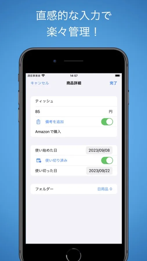 - 商品の使用開始日、使い切り日、そして価格を簡単に入力。