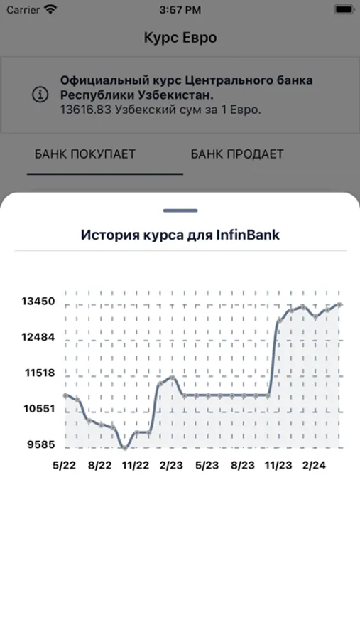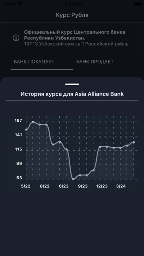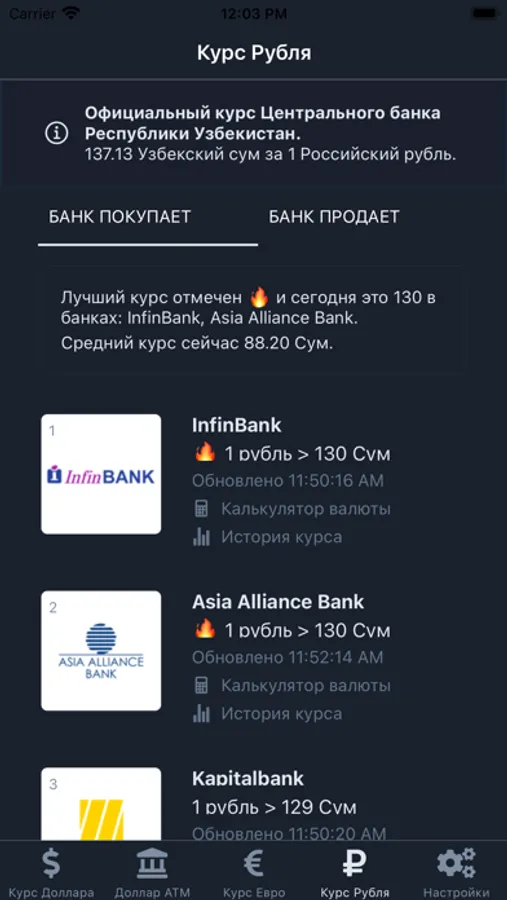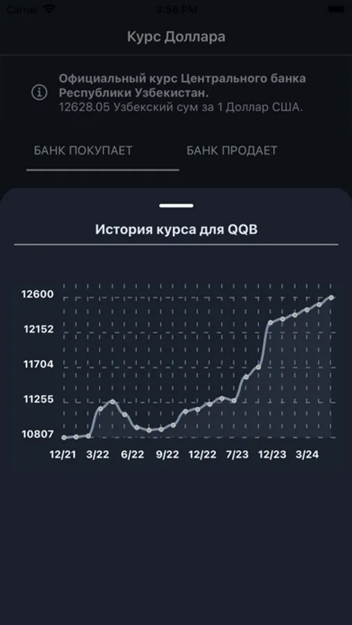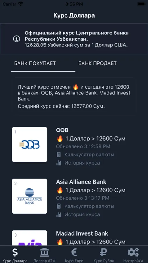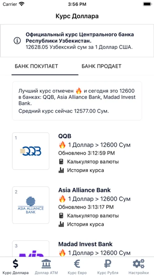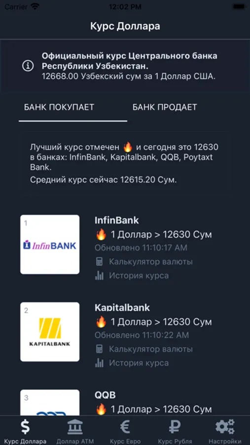 Track real-time exchange rates from banks in six countries: Uzbekistan, Kazakhstan, Georgia, Tajikistan, Kyrgyzstan, and Russia. We collect buy and sell rates so you always know where to get the best deal.