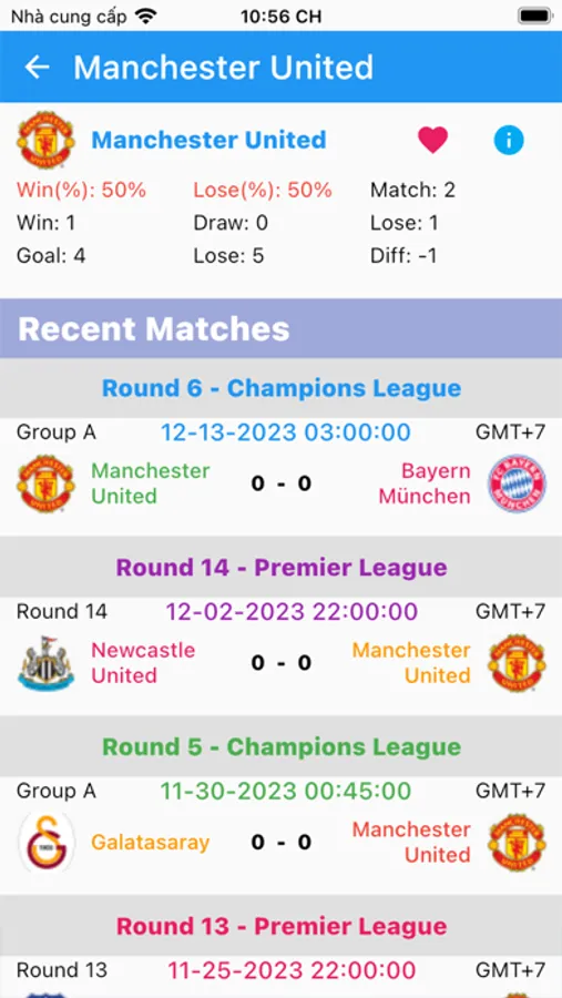 For each favorite team, you can view match statistics: match number, wins, losses, win and loss ratios, ....