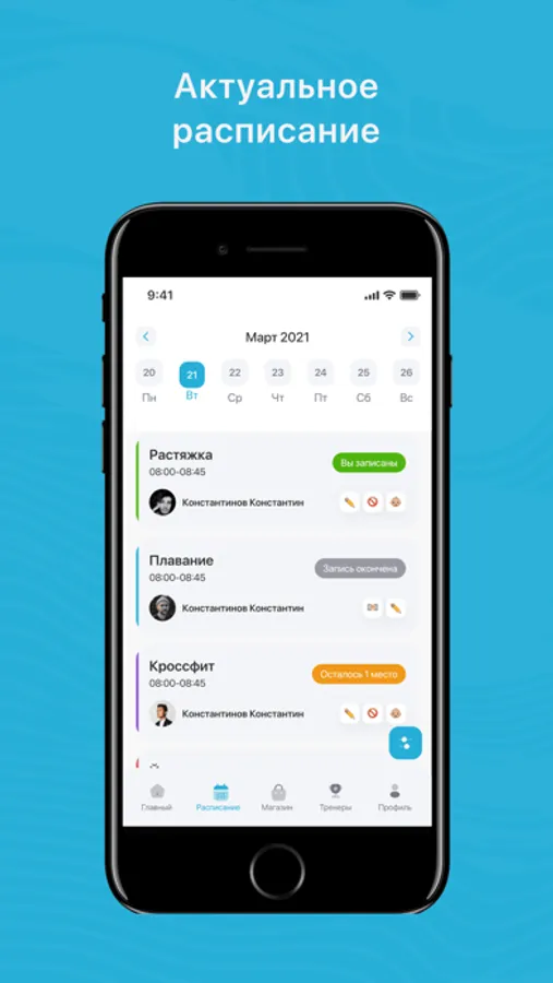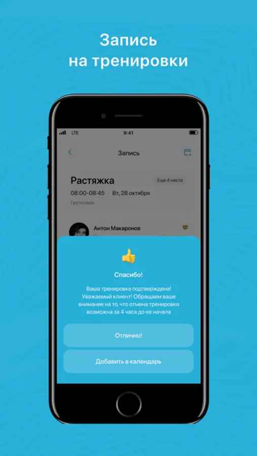 - Получать PUSH-уведомления о предстоящей тренировке;