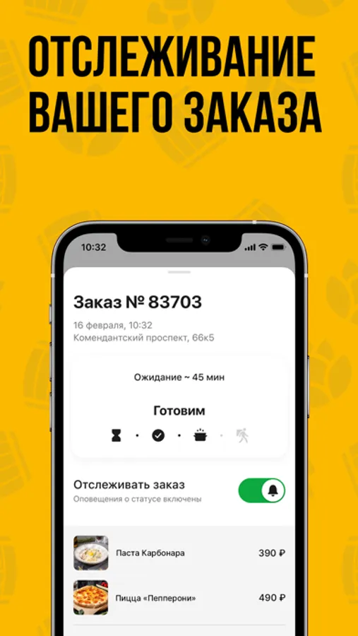 - Возможность отслеживать статус заказа и местоположение курьера.