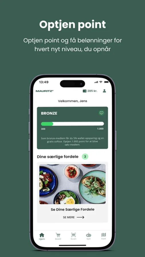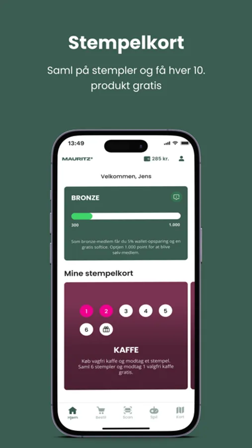 Betaling - Scan QR-kode: Når du foretager et køb i Caféen, skal du scanne QR-koden, inden du betaler, for at modtage dine point, belønninger og rabatter.