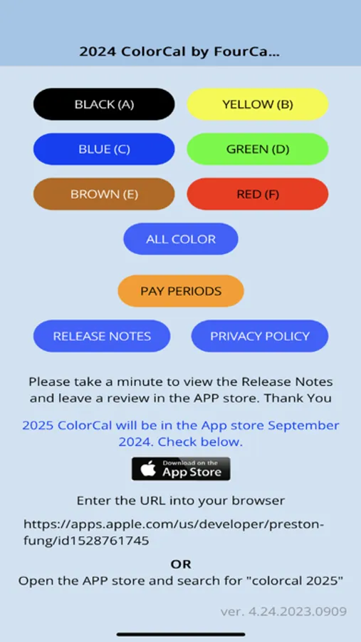 Color coded day-off calendar for Sunday/Rotating day off schedules.