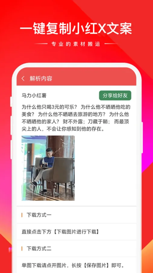马力小红存图是一款专门辅助用户图片下载、视频下载工具。支持一键保存多张图片、保存高清大图、视频等,解决用户不能一次性保存多张图片、图片视频不够高清的烦恼,适用于电商、微商、自媒体、微博博主、网络红人等。
