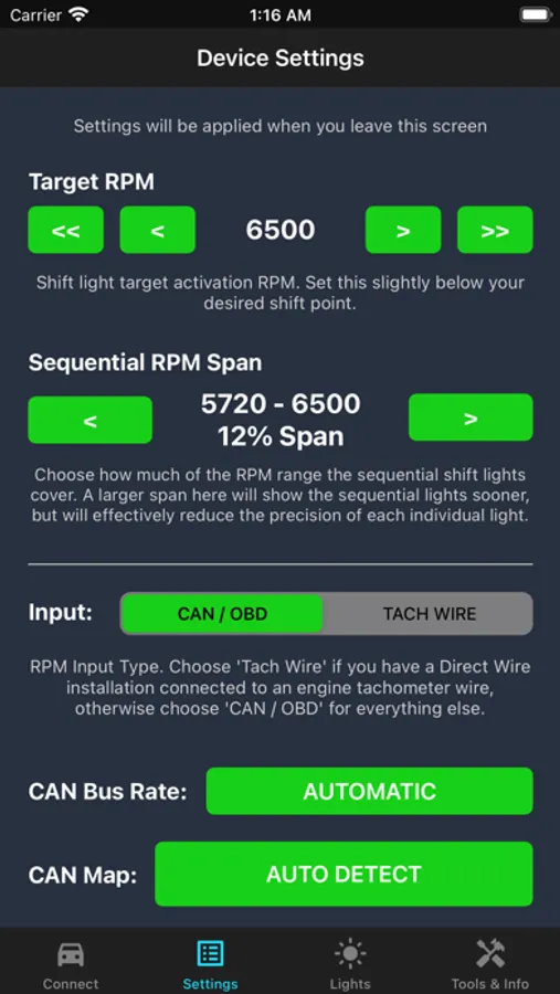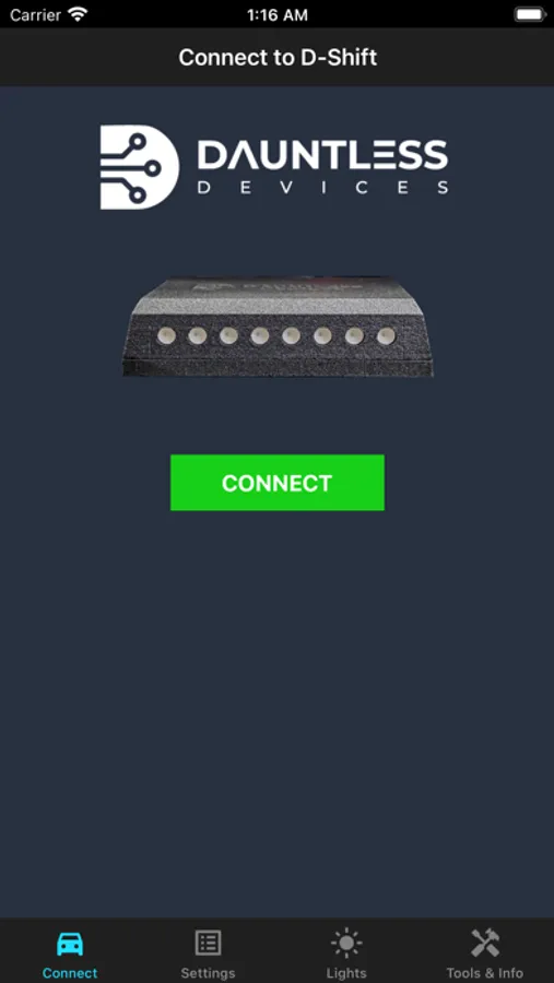 A D-Shift shift light from Dauntless Devices LLC is required to use this app. Other devices are not supported.