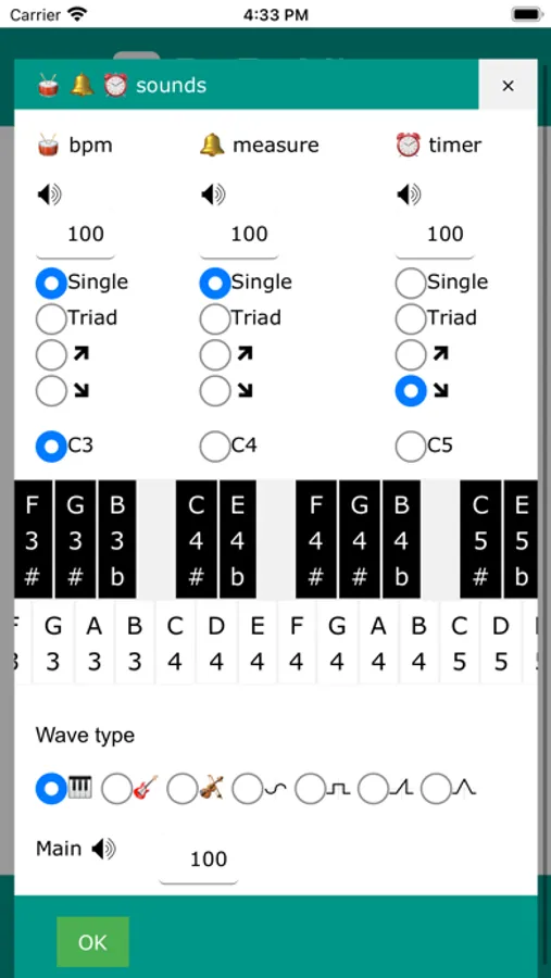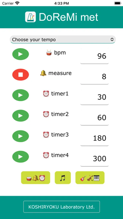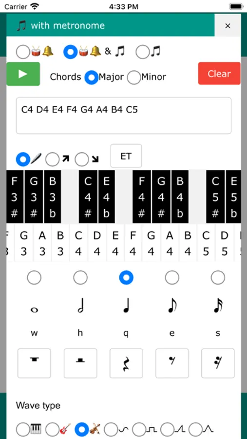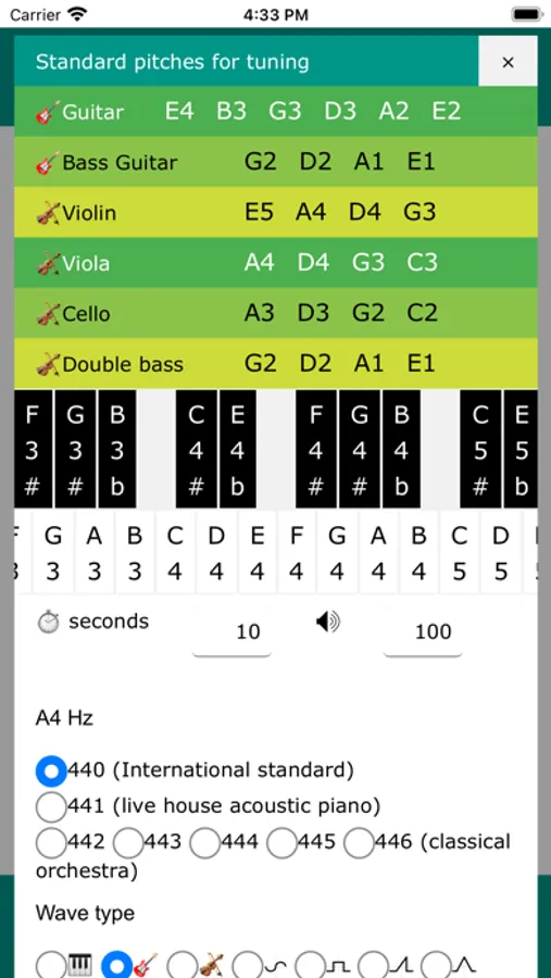また、ギターやバイオリンの チューニング用に 基準音程のロングトーン音も 聞くことができます。 A4 を 440Hz ~ 446Hz に微調整できます)