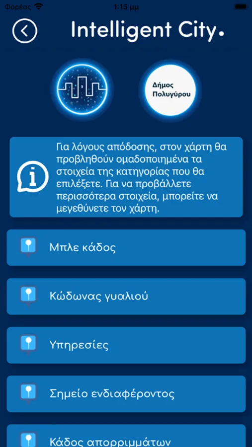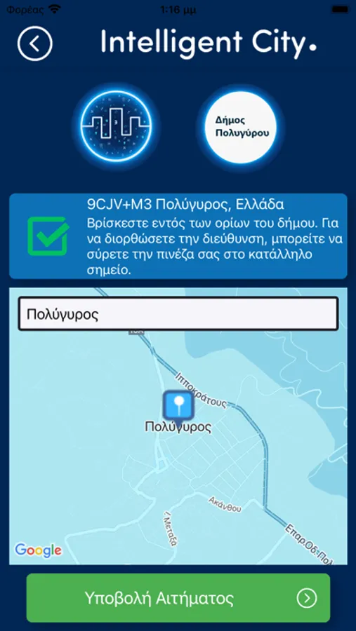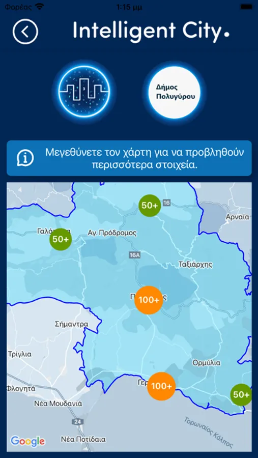 Επίσης παρέχεται η δυνατότητα προβολής των σημείων αποτύπωσης του Δήμου Πολυγύρου, με την χρήση της πλατφόρμας CityPoints του Intelligent City.