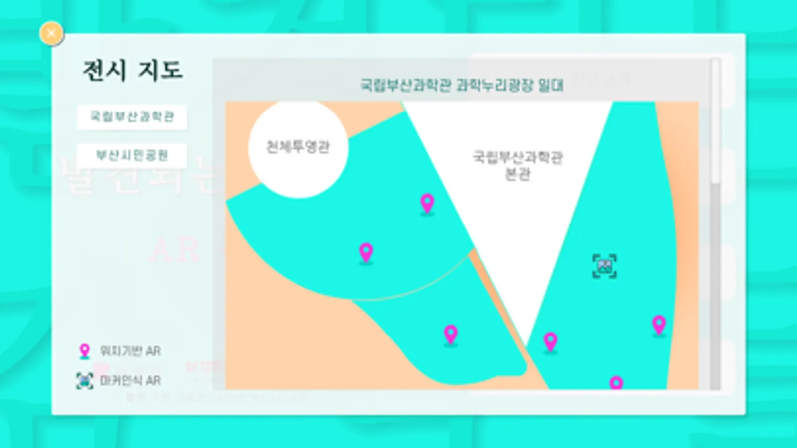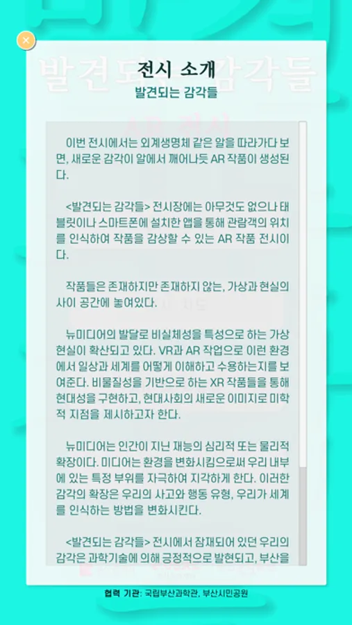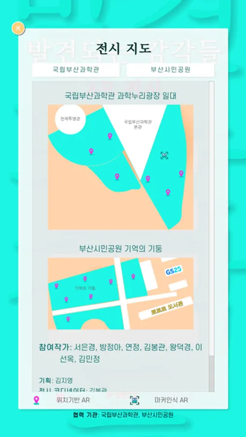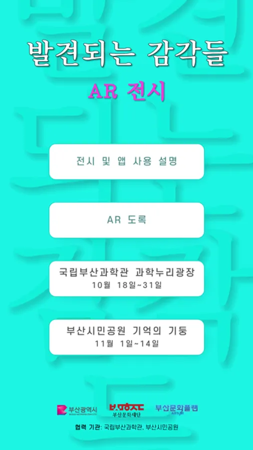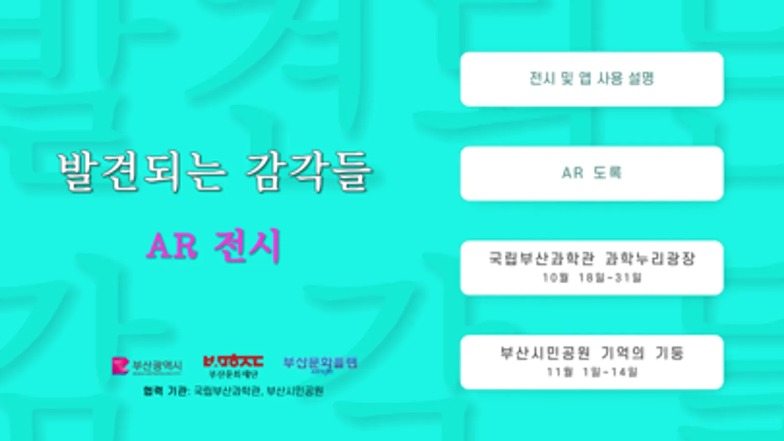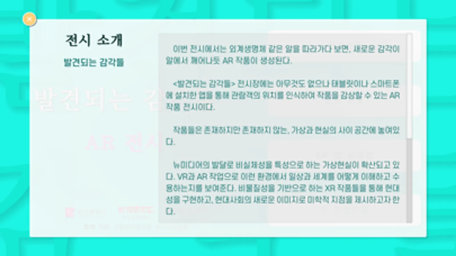 '발견되는 감각들' 전시는 위치기반 AR과 이미지 인식 AR로 구성되어 있습니다. 전시 기간에 전시가 진행되는 장소에서 앱을 사용하면 전시를 감상할 수 있습니다.