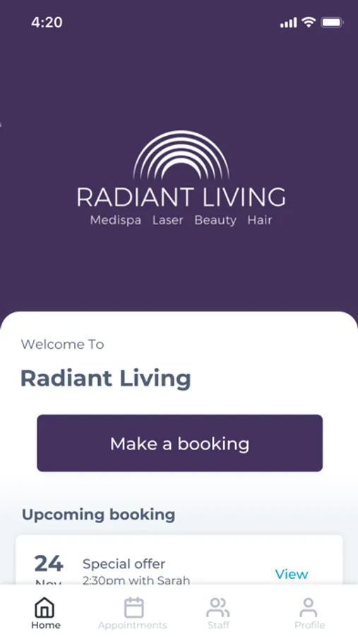 The Radiant Living app makes booking your appointments and managing your loyalty points even easier. You're just a few taps away from feeling good and looking great!