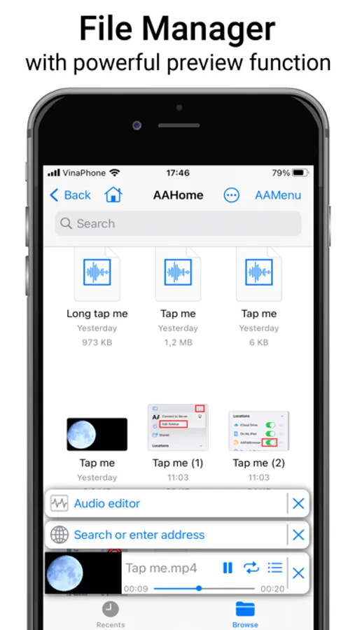 • Powerful media preview function: just tap on a media file, and it will play immediately in a small window