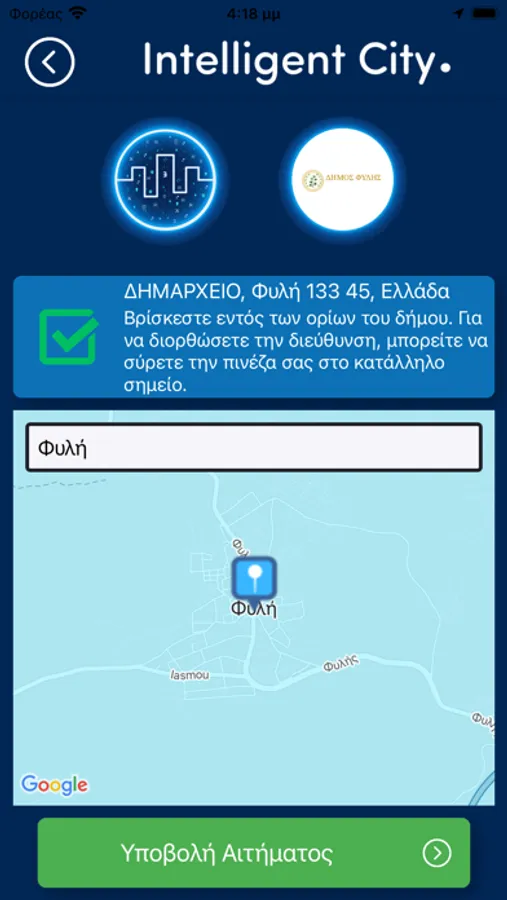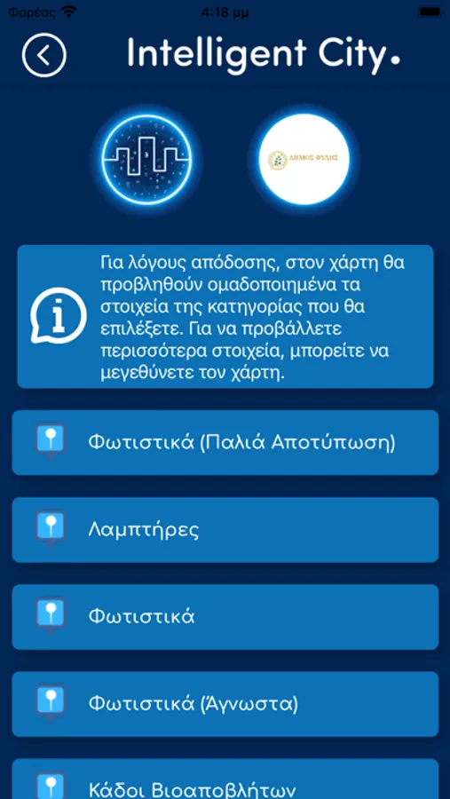 Επίσης παρέχεται η δυνατότητα προβολής των σημείων αποτύπωσης του Δήμου Φυλής, με την χρήση της πλατφόρμας CityPoints του Intelligent City.