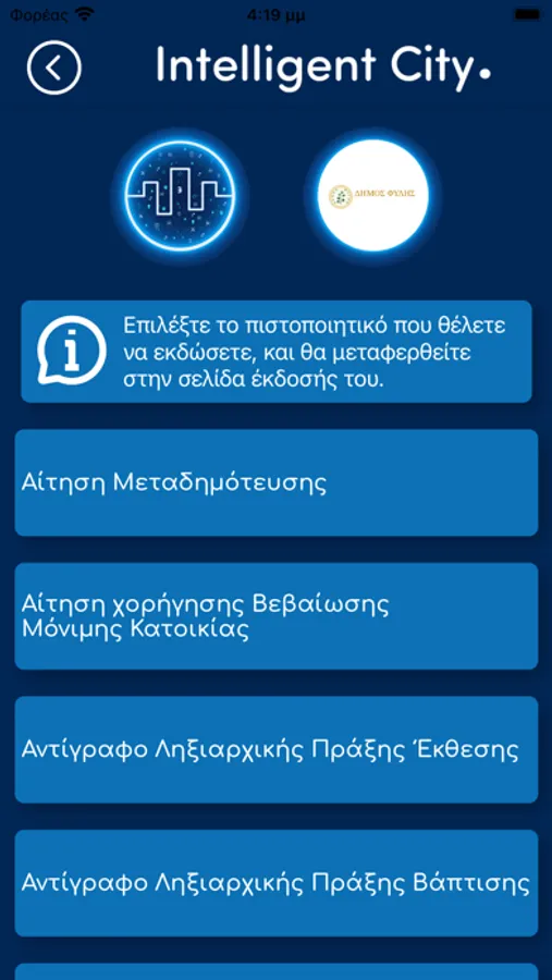 Τέλος, οι Δημότες μπορούν να χρησιμοποιήσουν την υπηρεσία CityCertify του IntelligentCity για να εκδώσουν με απλό και γρήγορο τρόπο τα πιστοποιητικά που επιθυμούν.