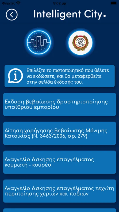 Τέλος, οι Δημότες μπορούν να χρησιμοποιήσουν την υπηρεσία CityCertify του IntelligentCity για να εκδώσουν με απλό και γρήγορο τρόπο τα πιστοποιητικά που επιθυμούν.