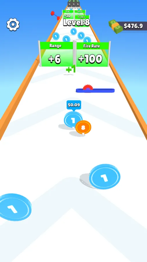 Shoot the coins with numbers to increase their value. Go through the doors to upgrade your projectile!