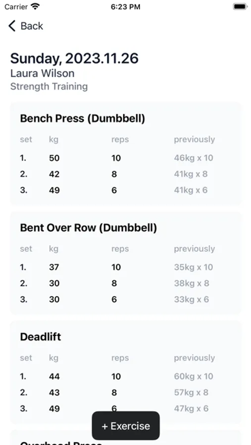 Easily log details of your clients' workout sessions, including exercises, sets, reps, and weights. This feature provides a comprehensive view of each client's exercise routine and progress.