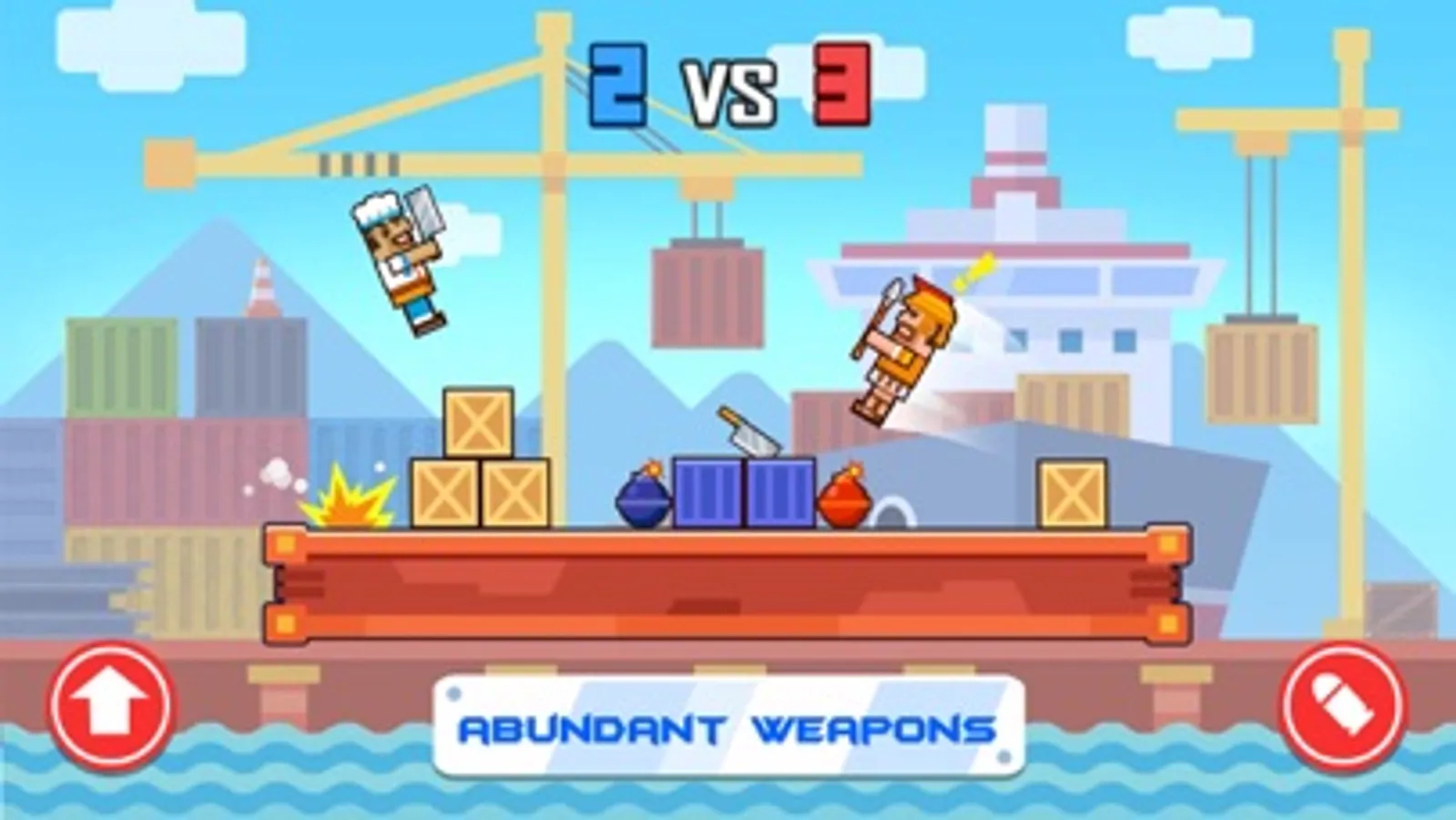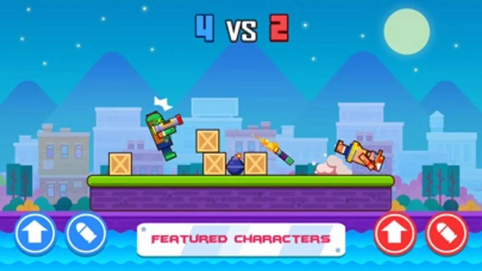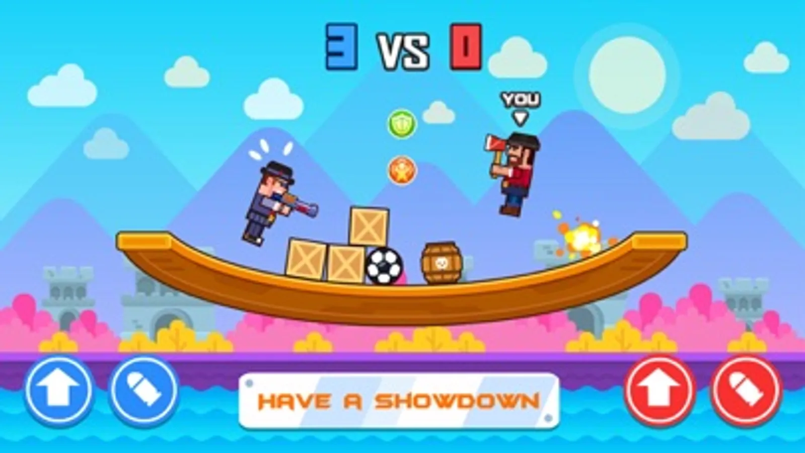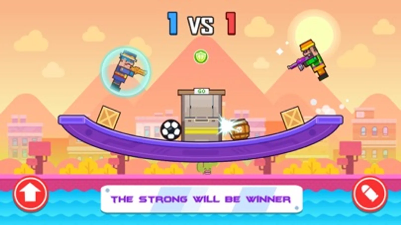 The gameplay is very simple. Tap the left button to dodge rival’s attack and tap the right button to shoot your rival. You will get a step back when you are shot. Be careful! Don’t fall into the water!