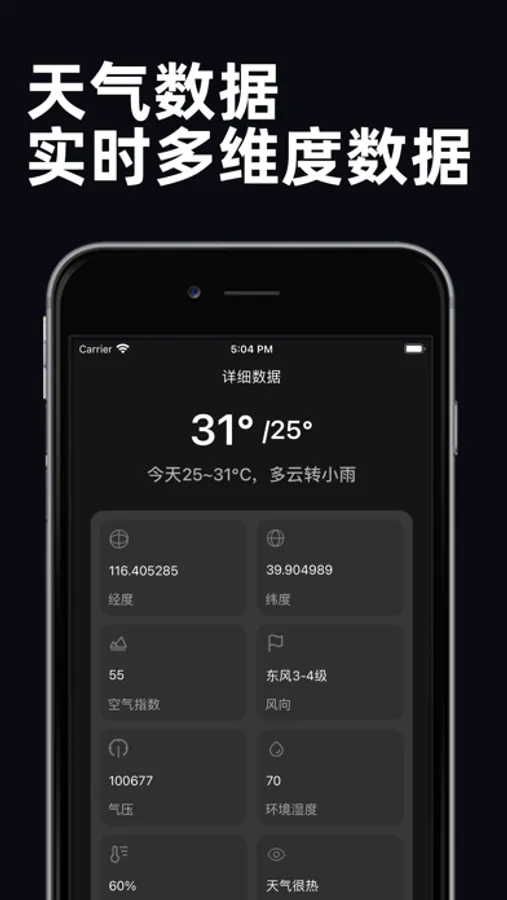 3、详细数据:展示当前城市的经纬度、空气指数、风向、气压、天气等相关信息。