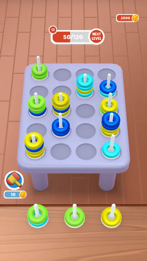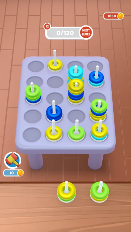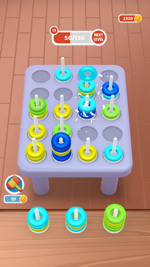 Unleash a vibrant world of color and strategy with "Torus Sort", puzzle game designed to ignite your thinking caps! In this captivating mobile game, navigate through a grid filled with stacks of multicolored rings. The goal? To tap and select a stack from your slots and strategically place them on the grid to create a burst of same-colored rings. A flurry of colors disappears with a satisfying pop when you align three or more rings of the same color.