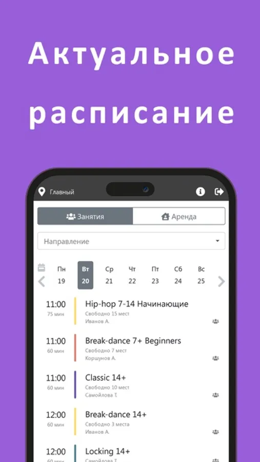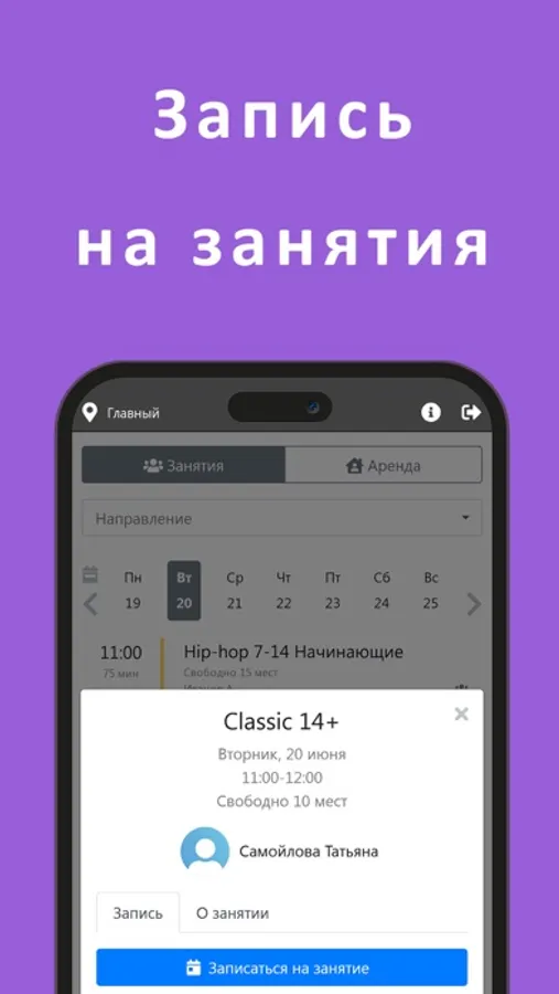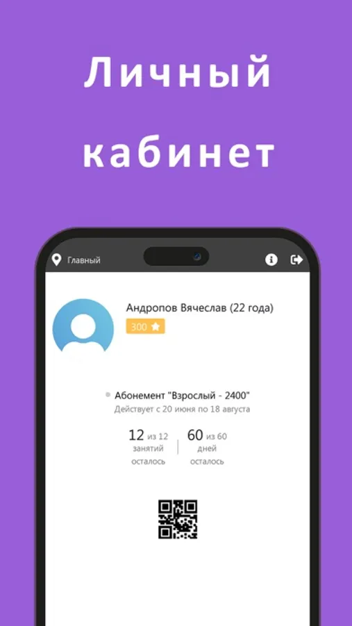 Приложение для просмотра расписания, действующего абонемента, посещений и записей на занятия.