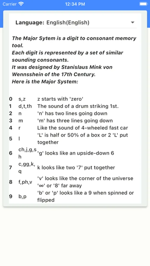 The app uses an internal dictionary of over 50,000 words to quickly create major system words with definitions. The words, formatted words(MaJoR), and definitions can each be copied by simply clicking them. There is also a handy popover which provides a reference of how the Major System works.