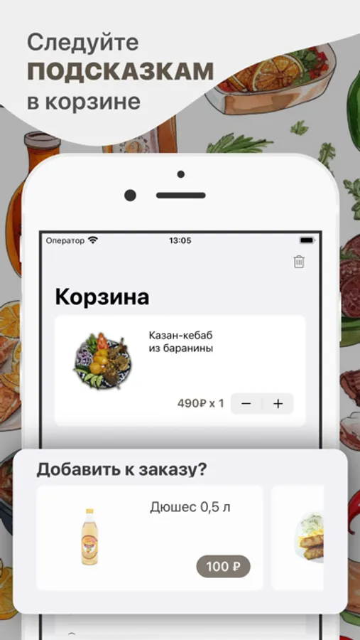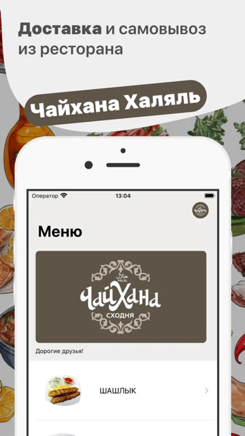 Как сделать заказ в приложении “Чайхана Халяль”: выберите понравившиеся позиции из меню, добавьте их в корзину и перейдите на экран оформления заказа (по нажатию на иконку корзины).