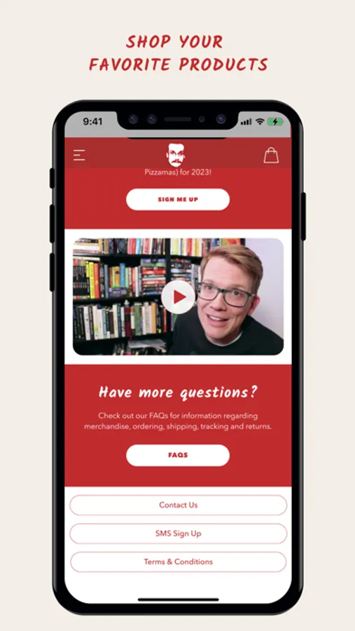 Pizzamas is high tech now! Download this app to skip the line and get Pizzamas directly on your phone. It has all of the features you love, whacky shirts, mustachioed authors, and products that make you say “why,” with none of the hassle of an internet browser. The app also provides early access to all products on the first day of Pizzamas, as well as a stream of exclusive dad jokes from noted comedian, Hank Green.