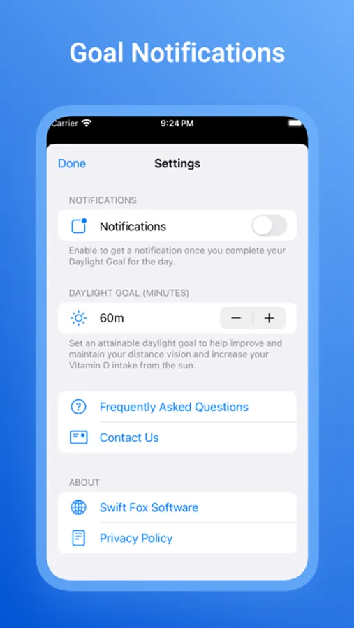 Life gets busy, but Daylight Goals keeps you on track. Receive personalized reminders and notifications nudging you to step outside and immerse yourself in the revitalizing embrace of sunlight. Effortlessly integrate these reminders into your daily routine, making prioritizing sunlight a breeze. Get a notification when you achieve your Daylight Goal and celebrate your achievements.