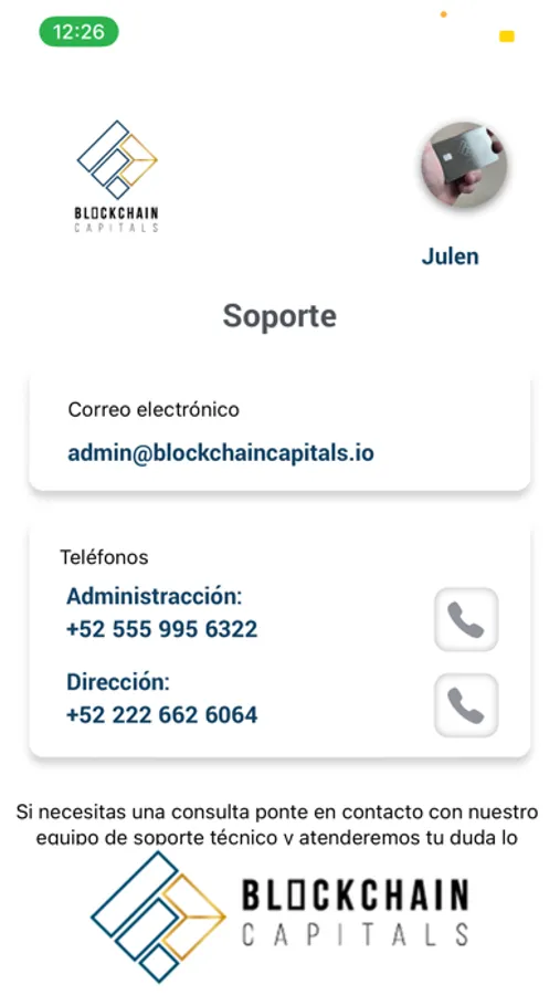 • Contacto: ¿Tienes alguna pregunta o necesitas asistencia? La sección de "Contacto" proporciona datos de contacto para la empresa Blockchain Cap SAPI. Puedes comunicarte fácilmente con nuestro equipo de atención al cliente.
