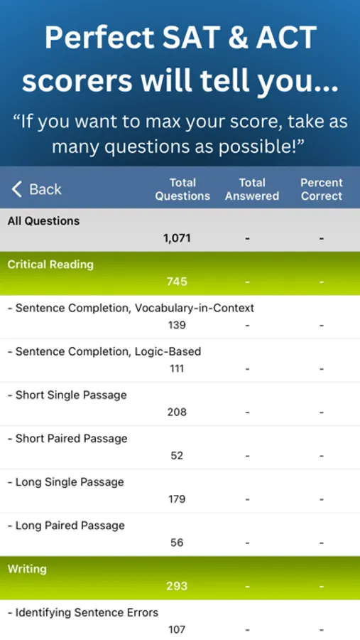 Your performance is displayed when you open the app, allowing you to track your progress and target your studies. TestBank tracks your cumulative performance, both overall and by subject area.