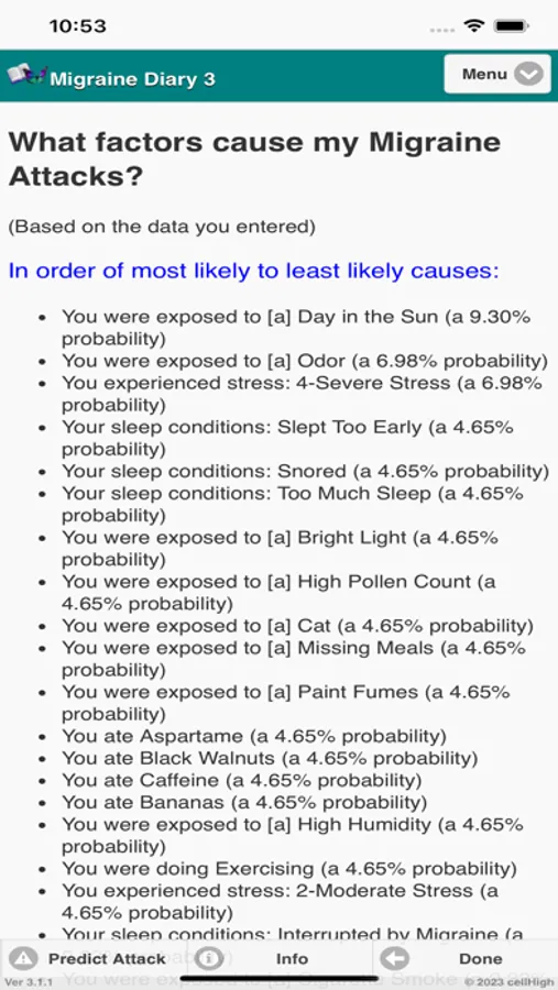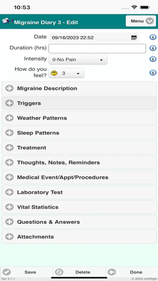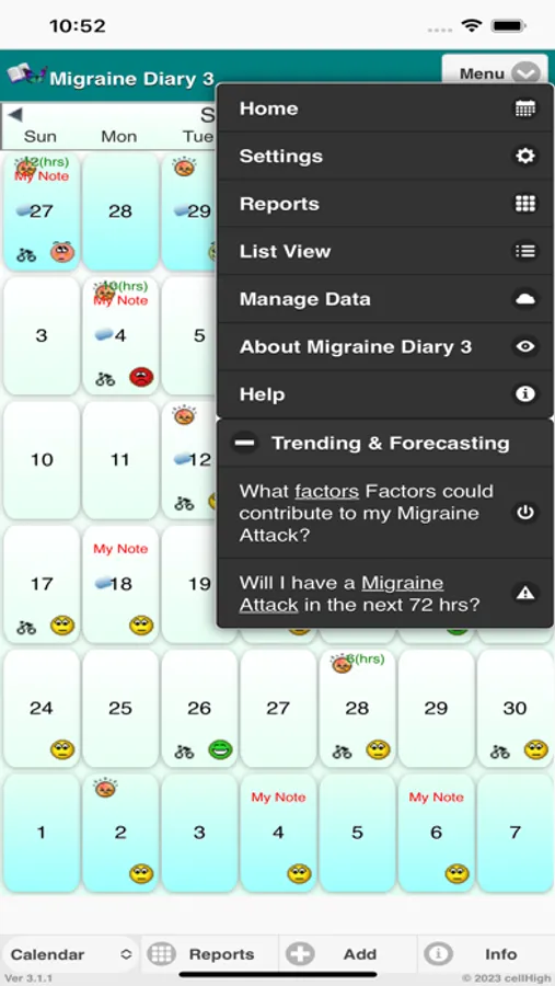 Are you like one of the 28 million Americans who experience migraine attacks? How can Migraine Diary 2 help? Migraine Diary was designed by a fellow migraine sufferer, to track information about your migraine with a few screen taps. Using this information, the application will allow you to use triggers, warning-signs and even things like day of month and week, weather patterns, diet, sleep patterns, blood pressure etc. to predict and manage your migraine attacks. Migraine Diary 2 has a new “Trending and Forecasting” module that shows you which factors and triggers contribute to your migraines. This will help you feel better and will allow you to take control of your Migraine. Migraine Diary2 makes it easy to perform tasks like tracking your treatment progress, graphing your patterns, emailing reports, including graphical attachments to your doctor and advisors. Migraine Diary 2 will also allow you to export your data to a spread sheet all with just a few screen taps. Do you want all of your Migraine health records and information at your fingertips so that you can start feeling better. Migraine Diary 2 can help.